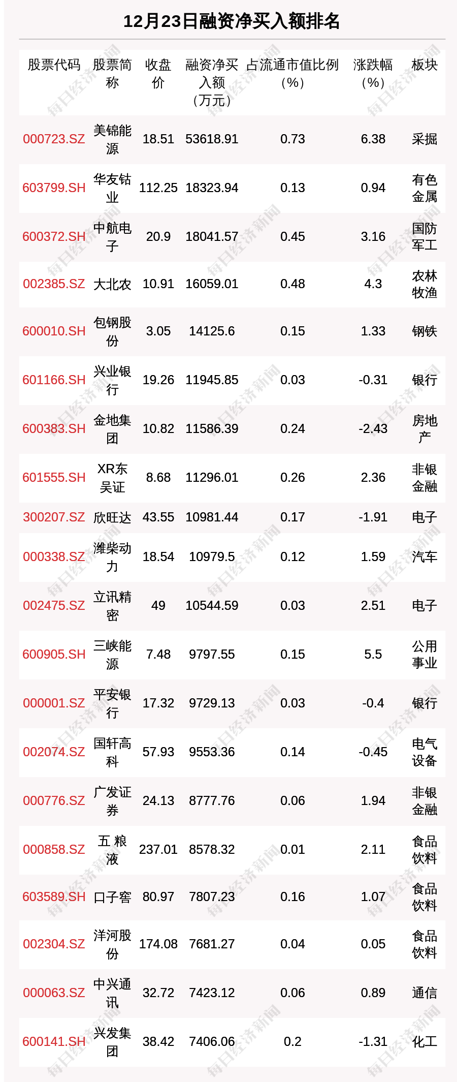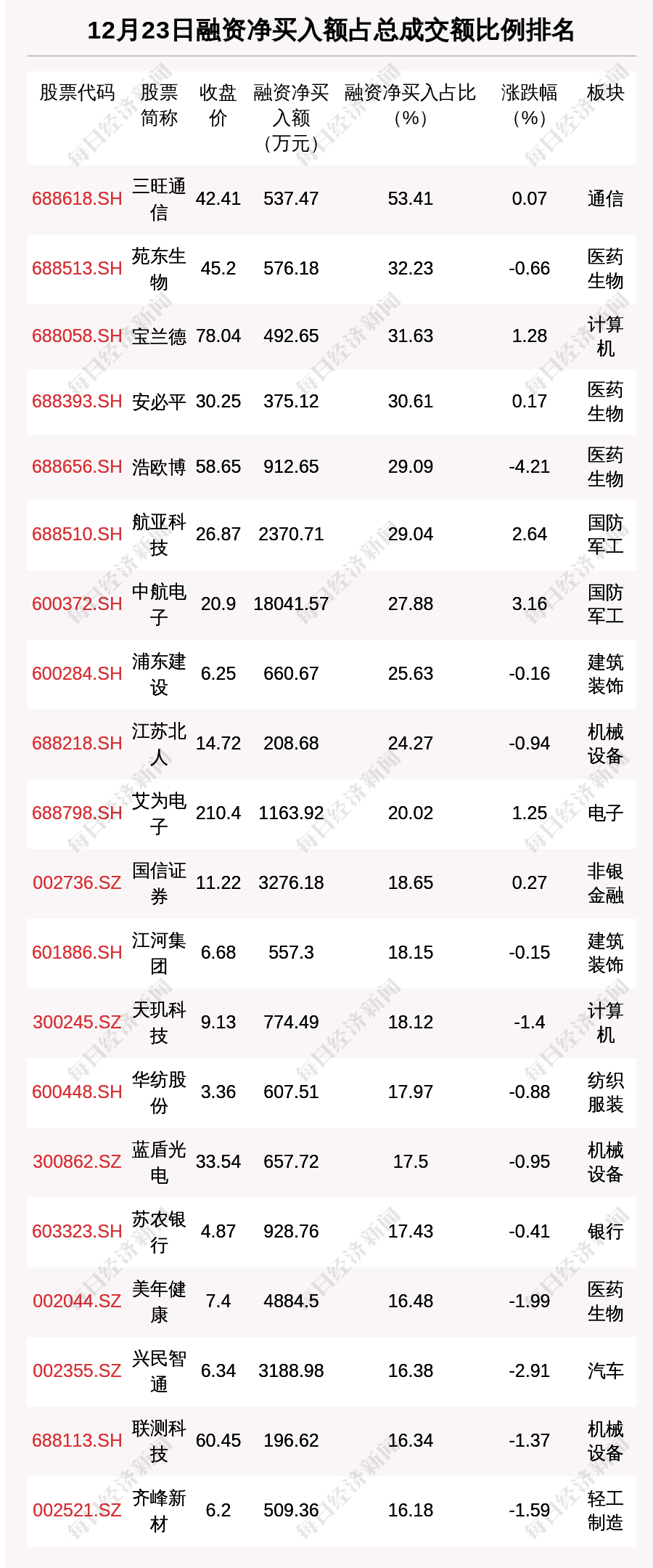 12月23日两市共有1185只个股有融资资金净买入。共有68只股票融资净买入额占总成交金额比例超10%,其中三旺通信、苑东生物、宝兰德排名前三,占比分别为53.41%、32.23%、31.63%。