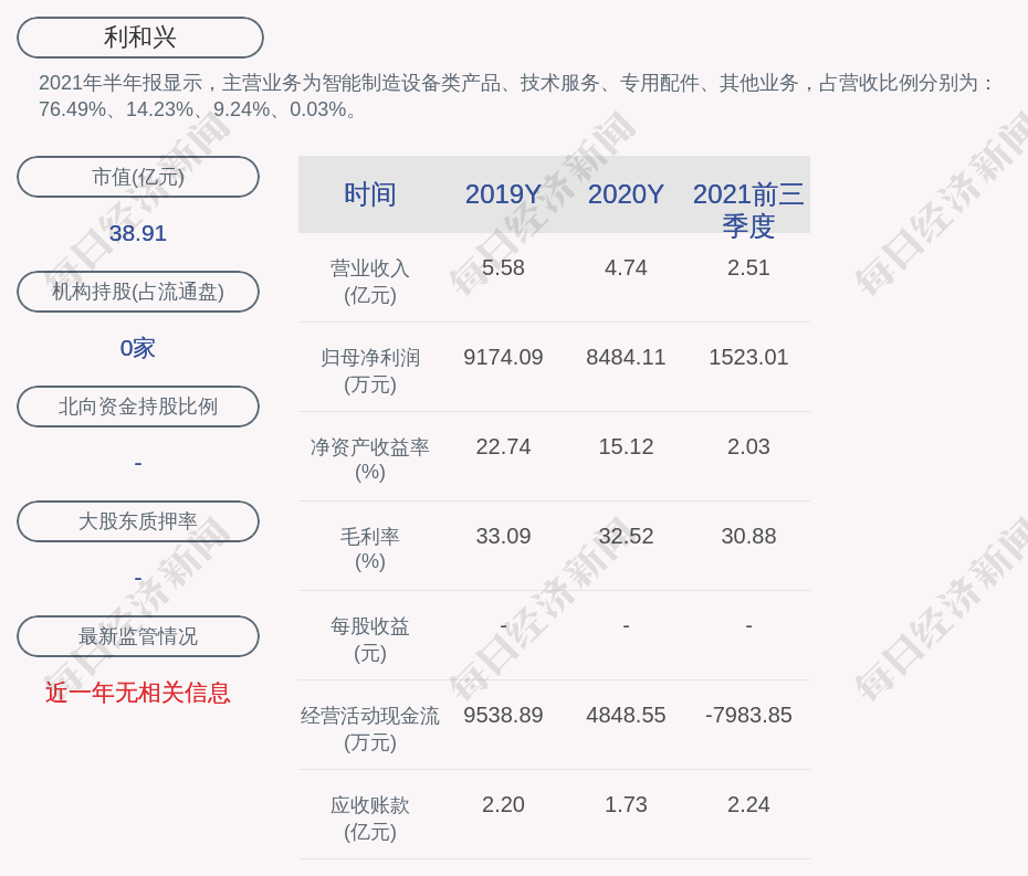 2021年半年报显示,利和兴的主营业务为智能制造设备类产品、技术服务、专用配件、其他业务,占营收比例分别为:76.49%、14.23%、9.24%、0.03%。