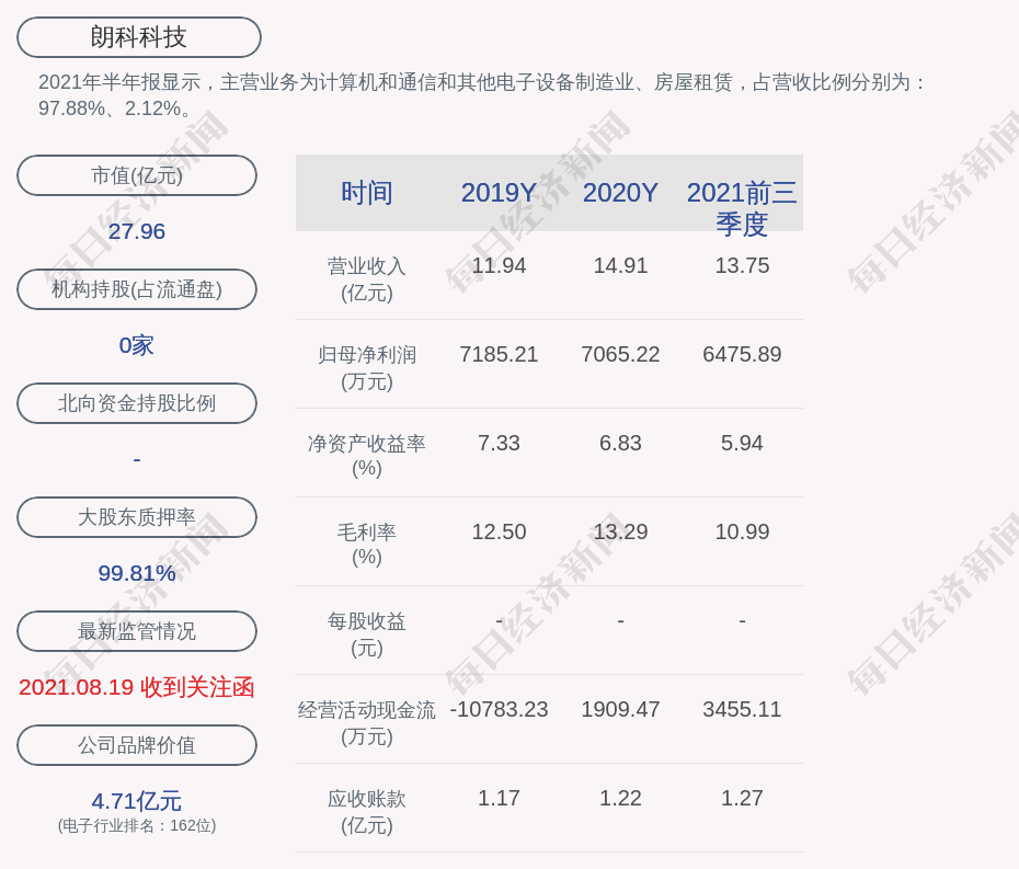 2021年半年报显示,朗科科技的主营业务为计算机和通信和其他电子设备制造业、房屋租赁,占营收比例分别为:97.88%、2.12%。