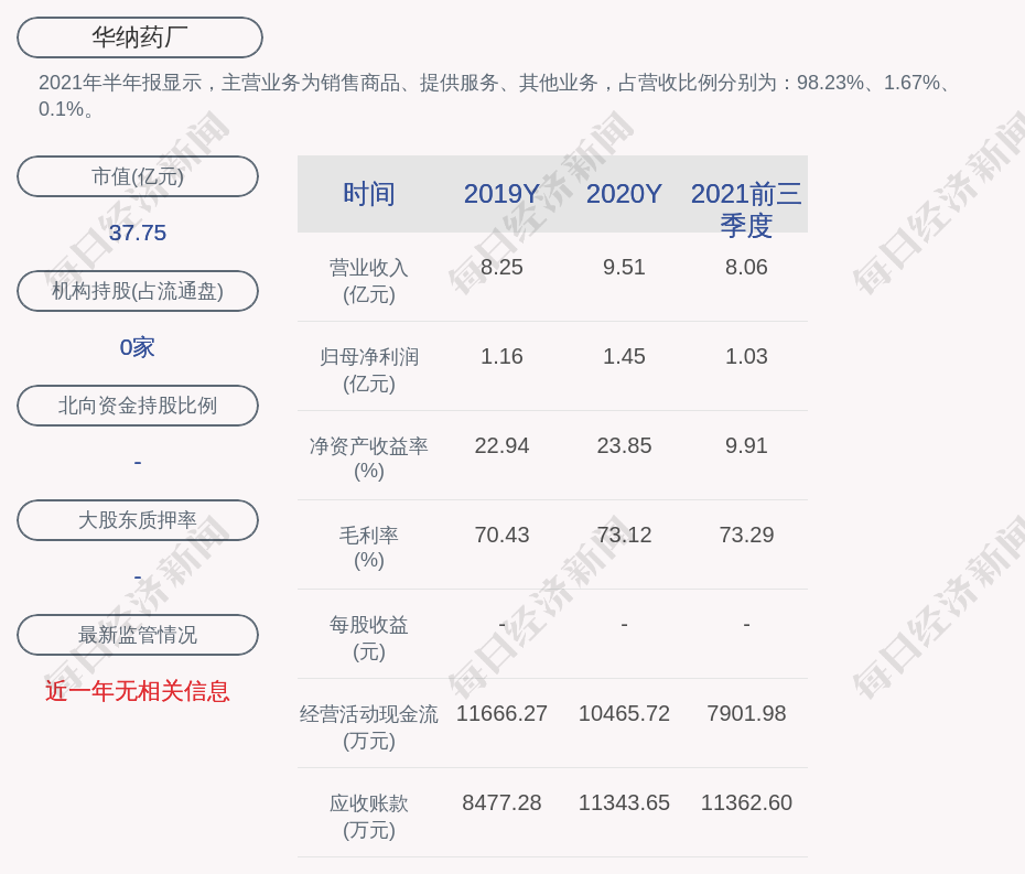 2021年半年报显示,华纳药厂的主营业务为销售商品、提供服务、其他业务,占营收比例分别为:98.23%、1.67%、0.1%。