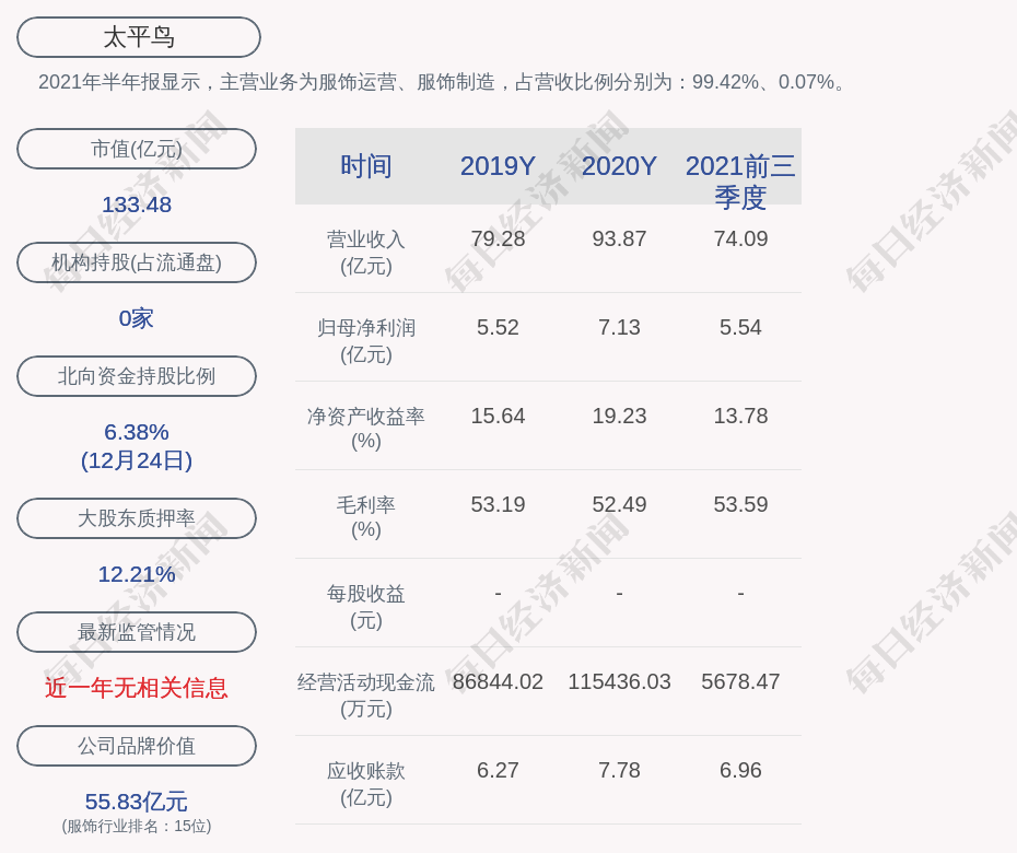 2021年半年报显示,太平鸟的主营业务为服饰运营、服饰制造,占营收比例分别为:99.42%、0.07%。
