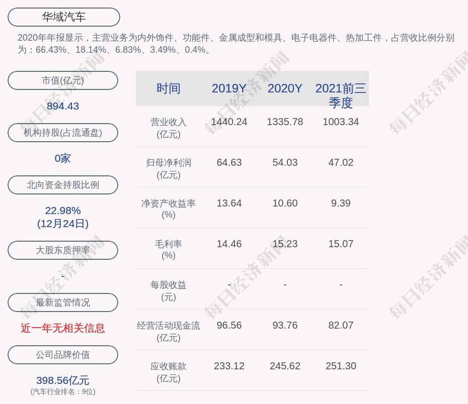 2020年年报显示,华域汽车的主营业务为内外饰件、功能件、金属成型和模具、电子电器件、热加工件,占营收比例分别为:66.43%、18.14%、6.83%、3.49%、0.4%。