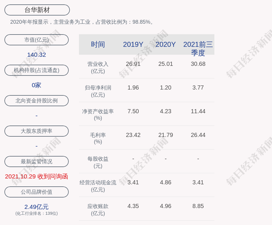 2020年年报显示,台华新材的主营业务为工业,占营收比例为:98.85%。