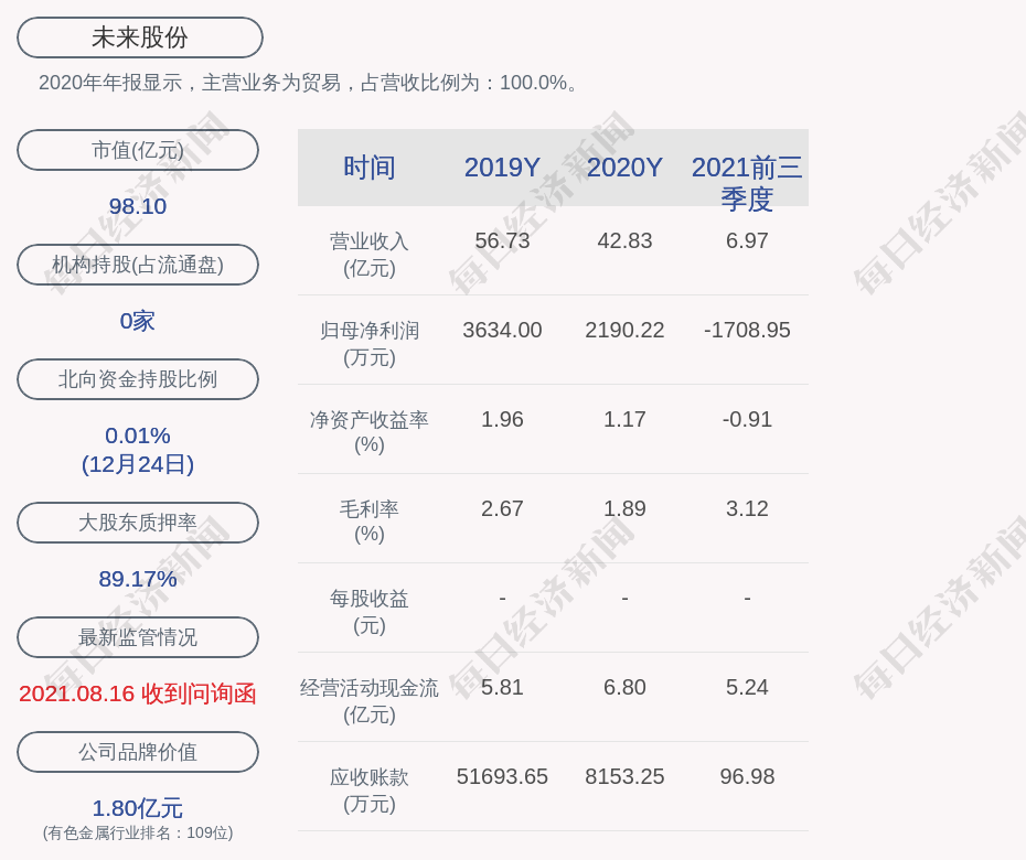 2020年年报显示,未来股份的主营业务为贸易,占营收比例为:100.0%。