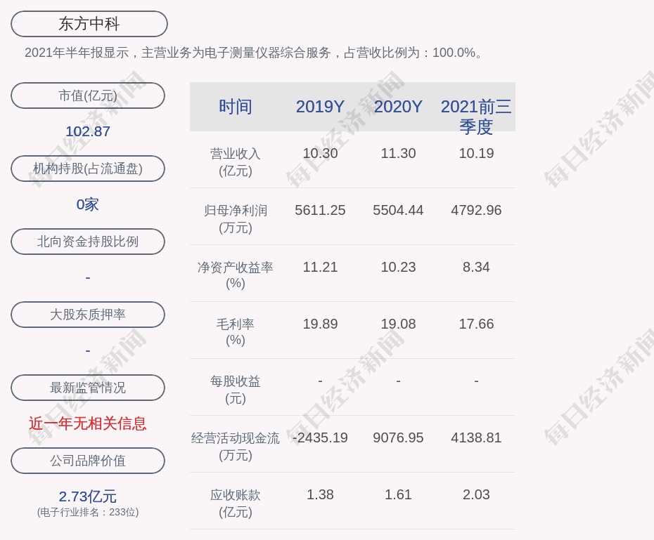 2021年半年报显示,东方中科的主营业务为电子测量仪器综合服务,占营收比例为:100.0%。