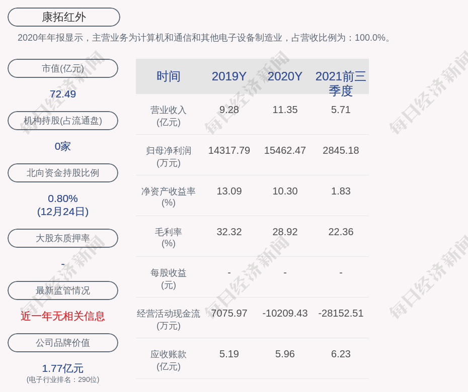 2020年年报显示,康拓红外的主营业务为计算机和通信和其他电子设备制造业,占营收比例为:100.0%。