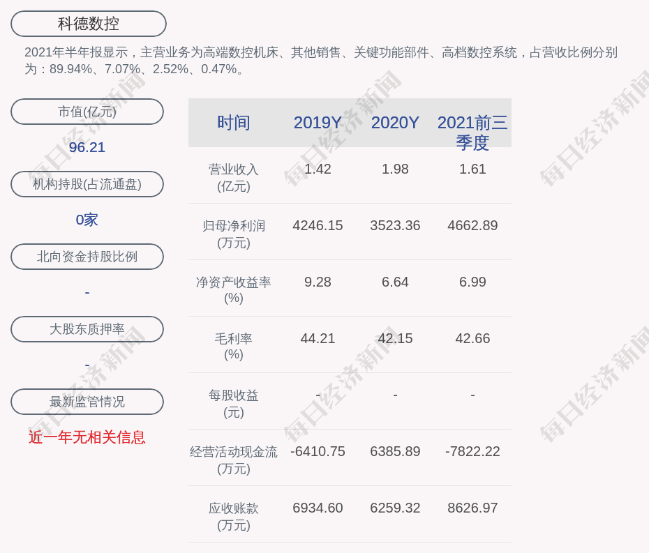 2021年半年报显示,科德数控的主营业务为高端数控机床、其他销售、关键功能部件、高档数控系统,占营收比例分别为:89.94%、7.07%、2.52%、0.47%。