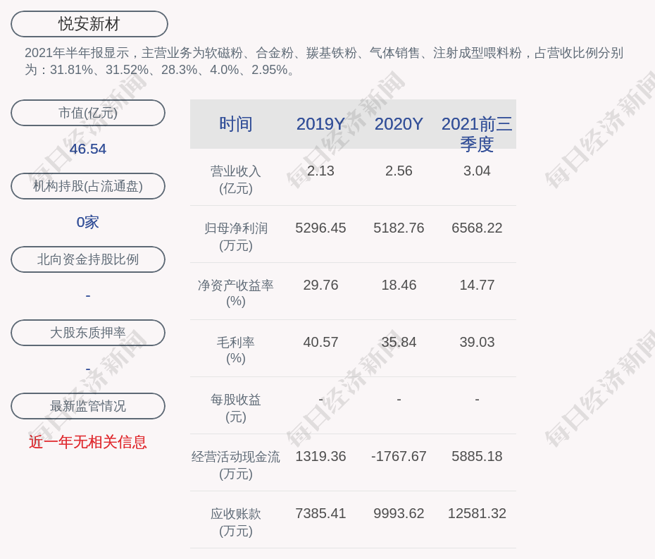 2021年半年报显示,悦安新材的主营业务为软磁粉、合金粉、羰基铁粉、气体销售、注射成型喂料粉,占营收比例分别为:31.81%、31.52%、28.3%、4.0%、2.95%。