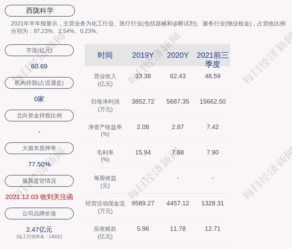 2021年半年报显示,西陇科学的主营业务为化工行业、医疗行业(包括器械和诊断试剂)、服务行业(物业租金),占营收比例分别为:97.23%、2.54%、0.23%。