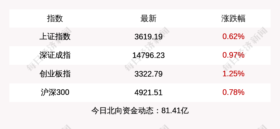 每经AI快讯:北京时间12月30日15:00,上证指数收盘上涨22.19点,涨幅为0.62%,报收3619.19点,成交额4139.48亿元;深证成指收盘上涨142.41点,涨幅为0.97%,报收14796.23点,成交额6039.19亿元;创业板指收盘上涨40.89点,涨幅为1.25%,报收3322.79点,成交额2432.84亿元;沪深300收盘上涨38.03点,涨幅为0.78%,报收4921.51点,成交额2680.22亿元。北上资金当日净流入81.41亿元。