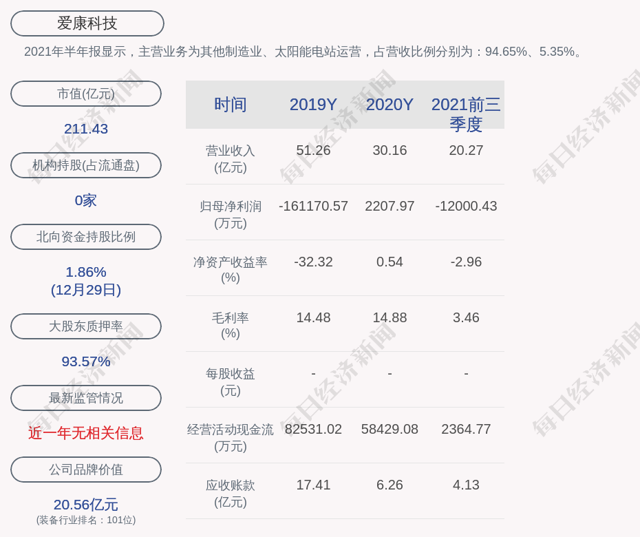 2021年半年报显示,爱康科技的主营业务为其他制造业、太阳能电站运营,占营收比例分别为:94.65%、5.35%。