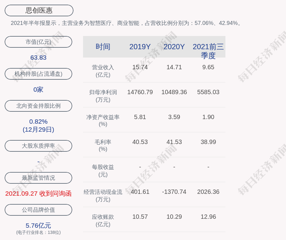 2021年半年报显示,思创医惠的主营业务为智慧医疗、商业智能,占营收比例分别为:57.06%、42.94%。
