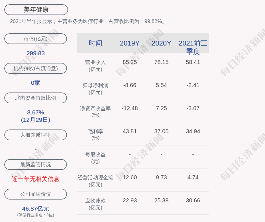 2021年半年报显示,美年健康的主营业务为医疗行业,占营收比例为:99.82%。