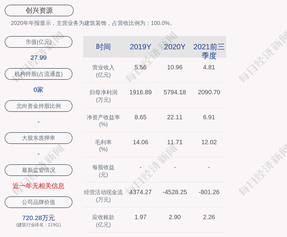 2020年年报显示,创兴资源的主营业务为建筑装饰,占营收比例为:100.0%。