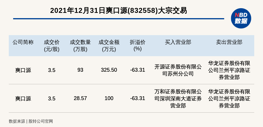 每经讯,2021年12月31日,新三板创新层公司爽口源(832558)发生2笔大宗交易,总成交金额为425.50万元,成交金额最高的一笔成交价3.5元/股,成交数量93万股,成交金额325.50万元,折价63.31%。买入营业部是开源证券股份有限公司苏州分公司,卖出营业部是华龙证券股份有限公司兰州平凉路证券营业部。