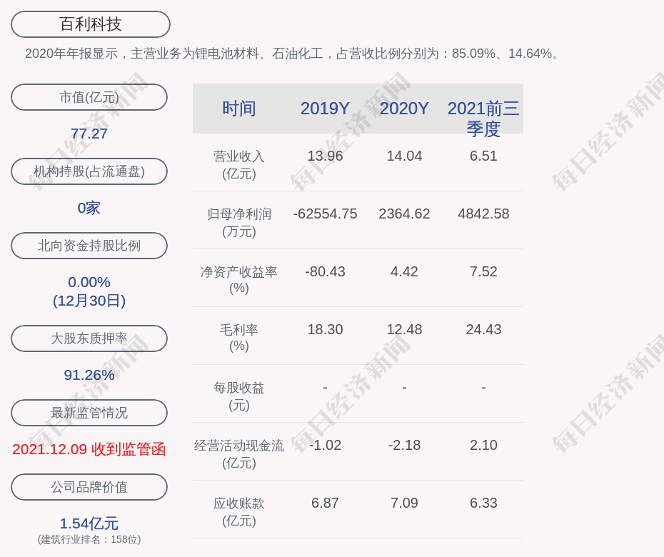 2020年年报显示,百利科技的主营业务为锂电池材料、石油化工,占营收比例分别为:85.09%、14.64%。