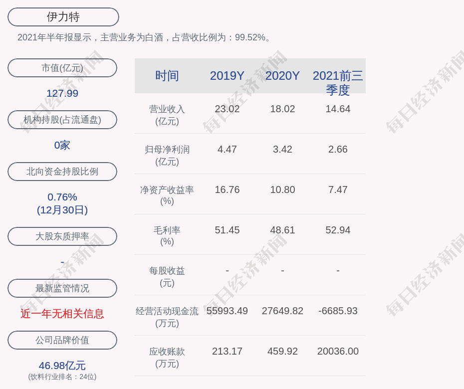 2021年半年报显示,伊力特的主营业务为白酒,占营收比例为:99.52%。