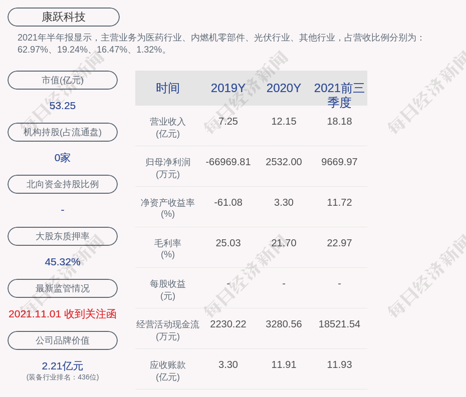 2021年半年报显示,康跃科技的主营业务为医药行业、内燃机零部件、光伏行业、其他行业,占营收比例分别为:62.97%、19.24%、16.47%、1.32%。