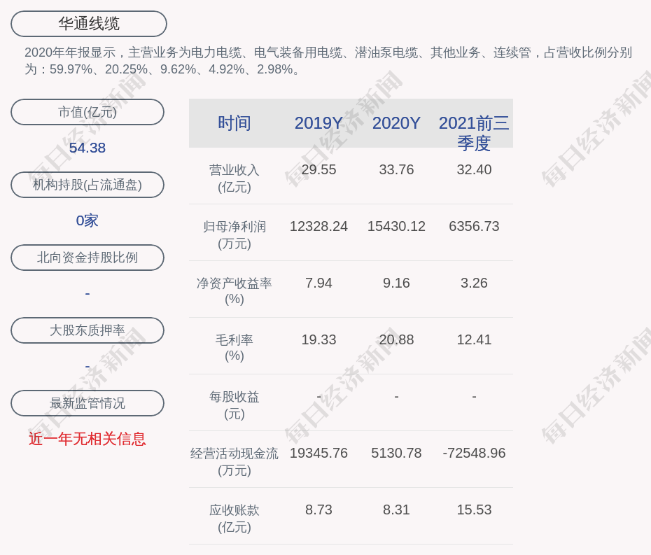 2020年年报显示,华通线缆的主营业务为电力电缆、电气装备用电缆、潜油泵电缆、其他业务、连续管,占营收比例分别为:59.97%、20.25%、9.62%、4.92%、2.98%。