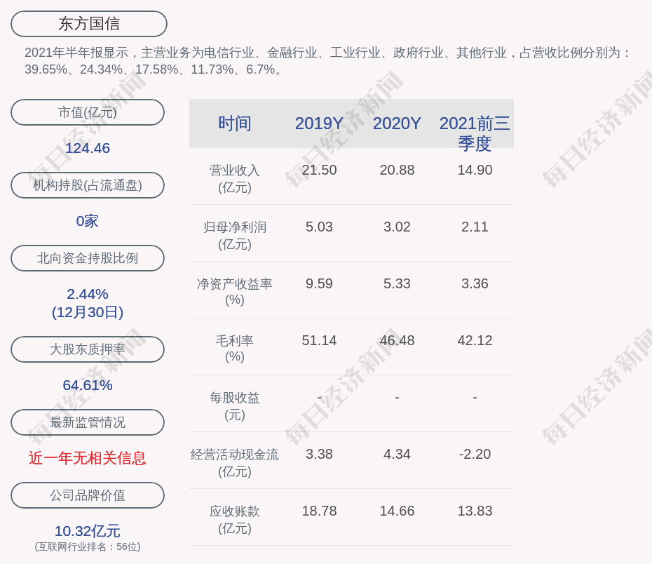 2021年半年报显示,东方国信的主营业务为电信行业、金融行业、工业行业、政府行业、其他行业,占营收比例分别为:39.65%、24.34%、17.58%、11.73%、6.7%。