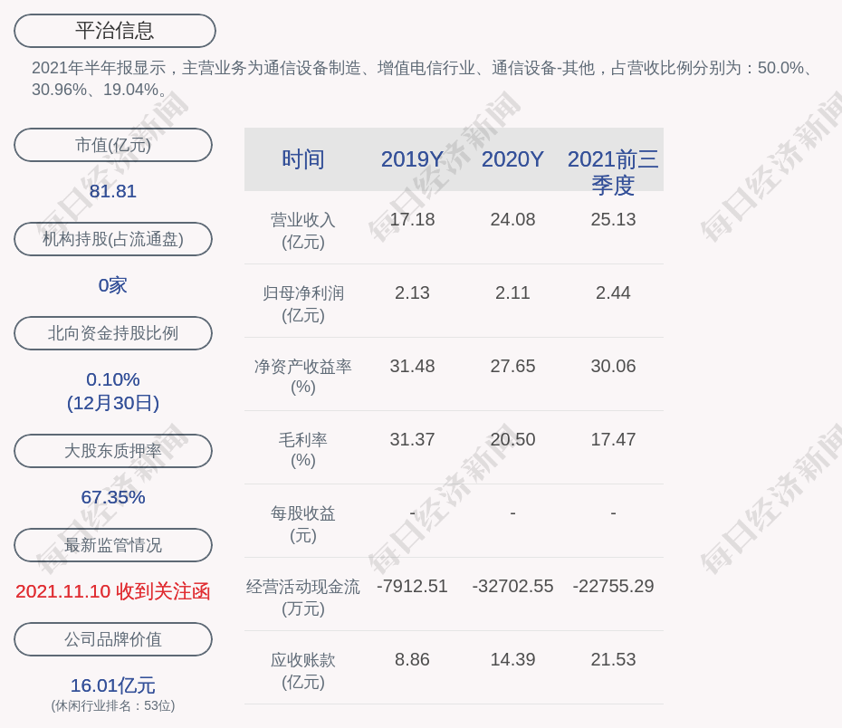 2021年半年报显示,平治信息的主营业务为通信设备制造、增值电信行业、通信设备-其他,占营收比例分别为:50.0%、30.96%、19.04%。