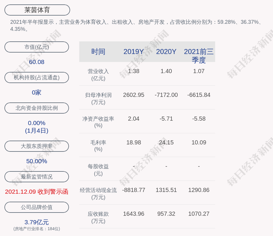 2021年半年报显示,莱茵体育的主营业务为体育收入、出租收入、房地产开发,占营收比例分别为:59.28%、36.37%、4.35%。