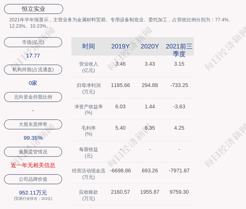 2021年半年报显示,恒立实业的主营业务为金属材料贸易、专用设备制造业、委托加工,占营收比例分别为:77.4%、12.23%、10.23%。
