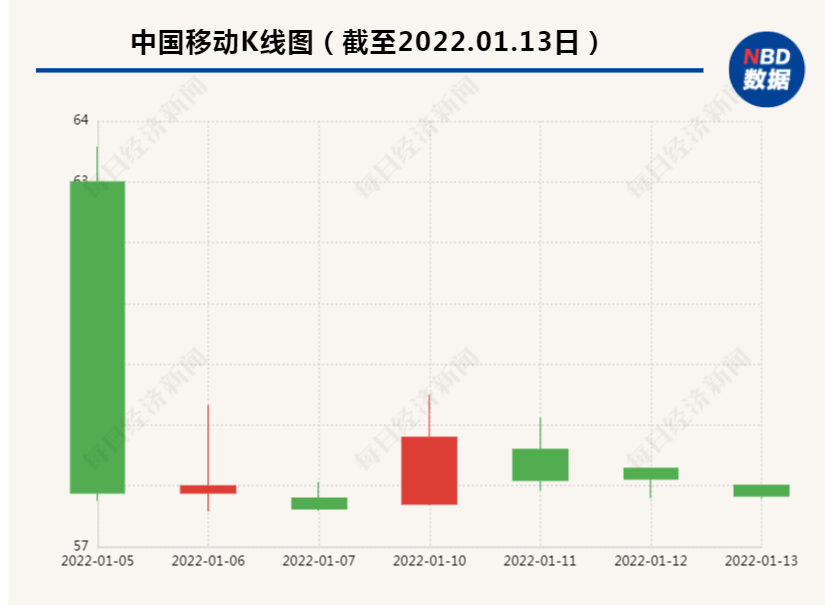中国移动于1月5日正式回归A股,截至目前,中国移动报57.82元/股 ,市值12328亿元。