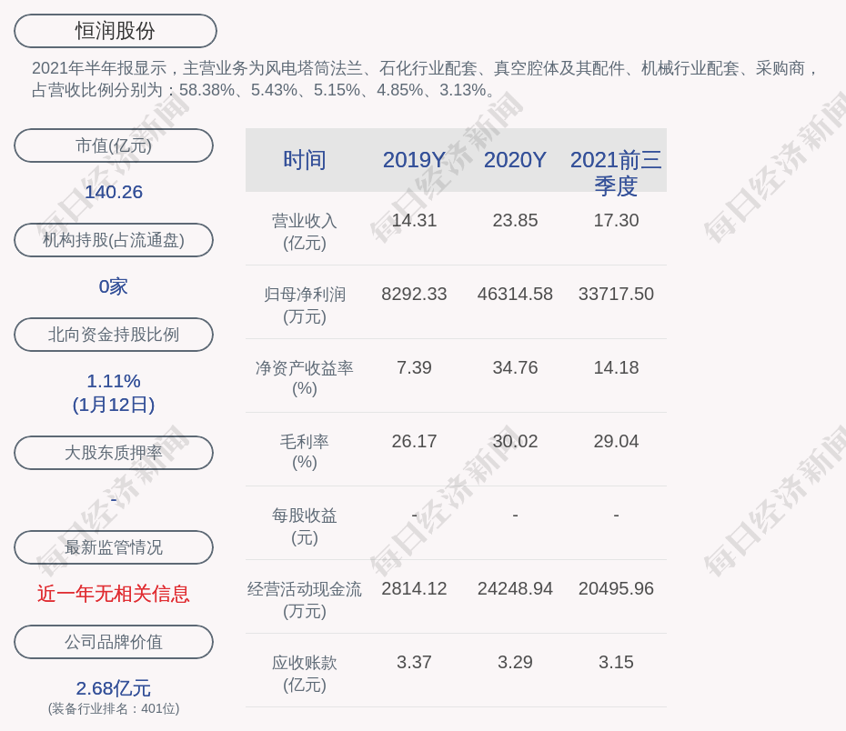 2021年半年报显示,恒润股份的主营业务为风电塔筒法兰、石化行业配套、真空腔体及其配件、机械行业配套、采购商,占营收比例分别为:58.38%、5.43%、5.15%、4.85%、3.13%。