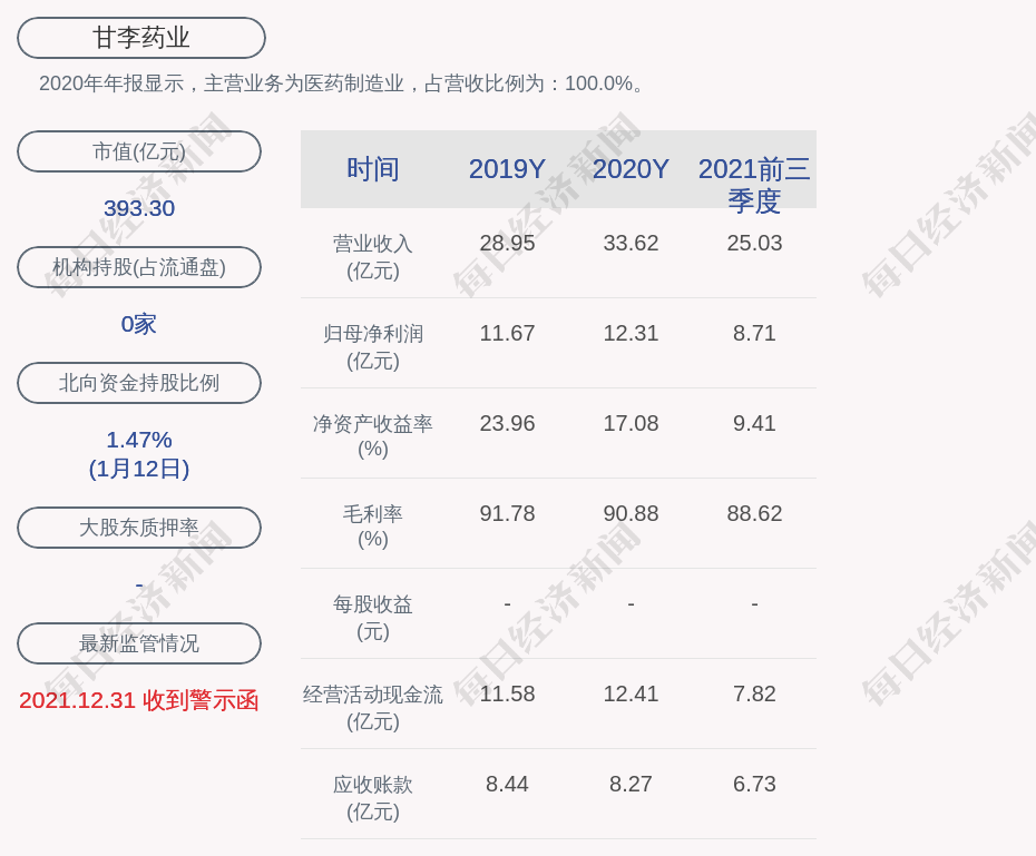 2020年年报显示,甘李药业的主营业务为医药制造业,占营收比例为:100.0%。