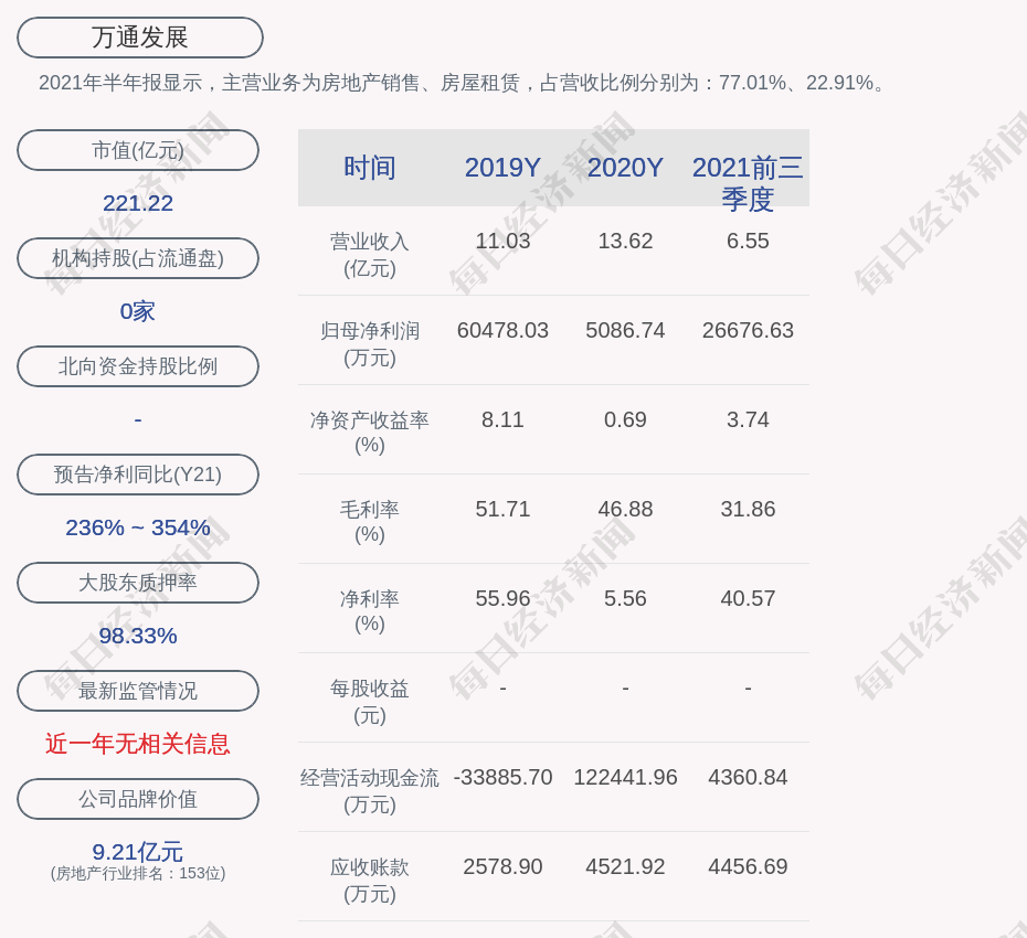 2021年半年报显示,万通发展的主营业务为房地产销售、房屋租赁,占营收比例分别为:77.01%、22.91%。