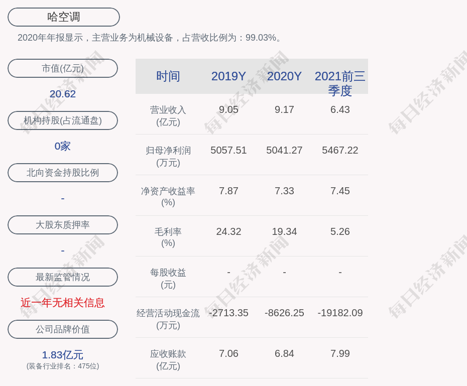 2020年年报显示,哈空调的主营业务为机械设备,占营收比例为:99.03%。