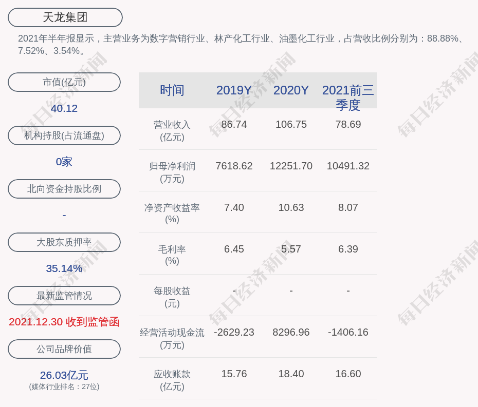 2021年半年报显示,天龙集团的主营业务为数字营销行业、林产化工行业、油墨化工行业,占营收比例分别为:88.88%、7.52%、3.54%。