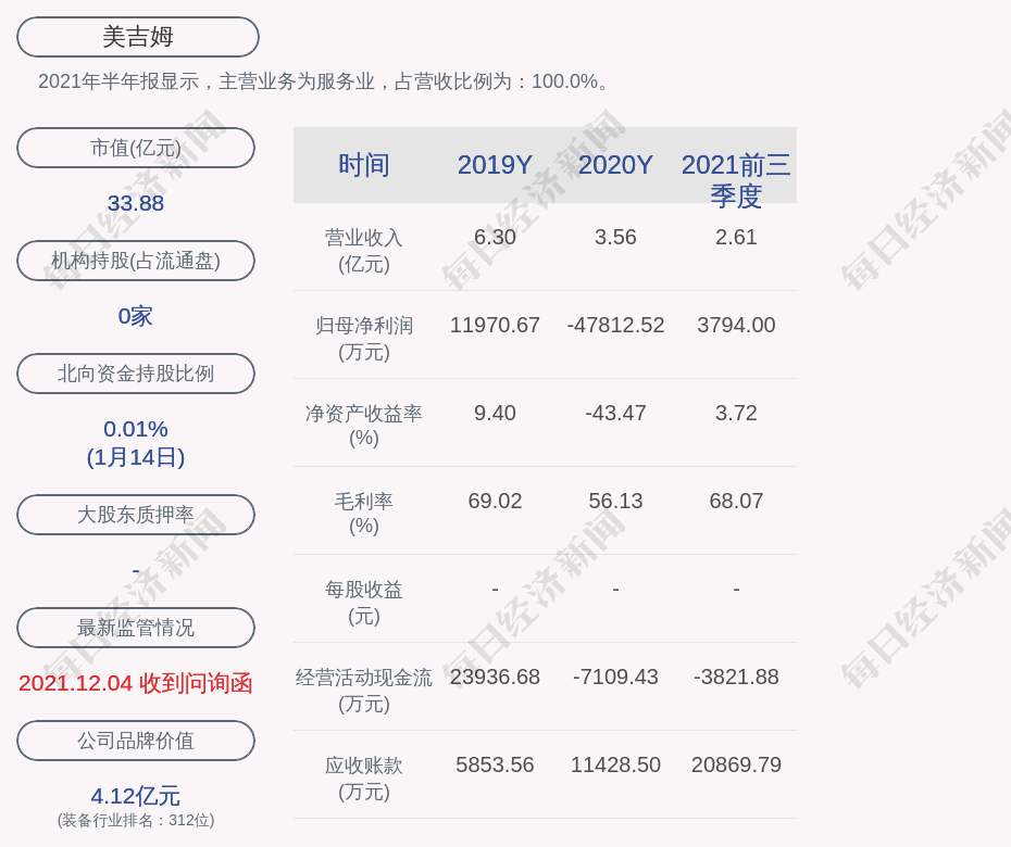 2021年半年报显示,美吉姆的主营业务为服务业,占营收比例为:100.0%。