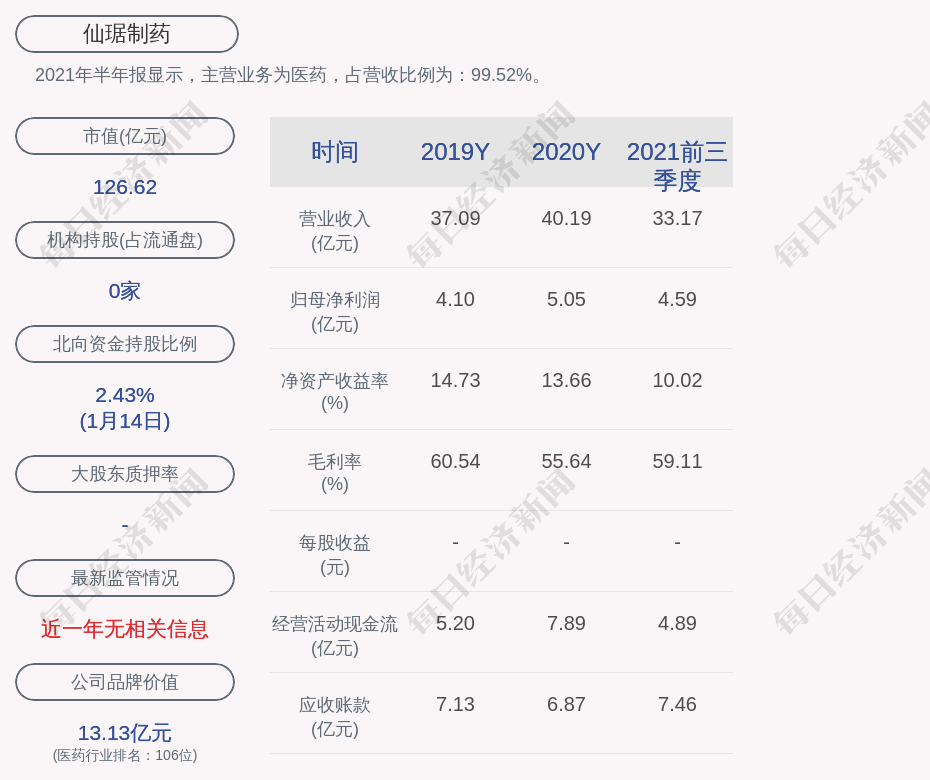 2021年半年报显示,仙琚制药的主营业务为医药,占营收比例为:99.52%。