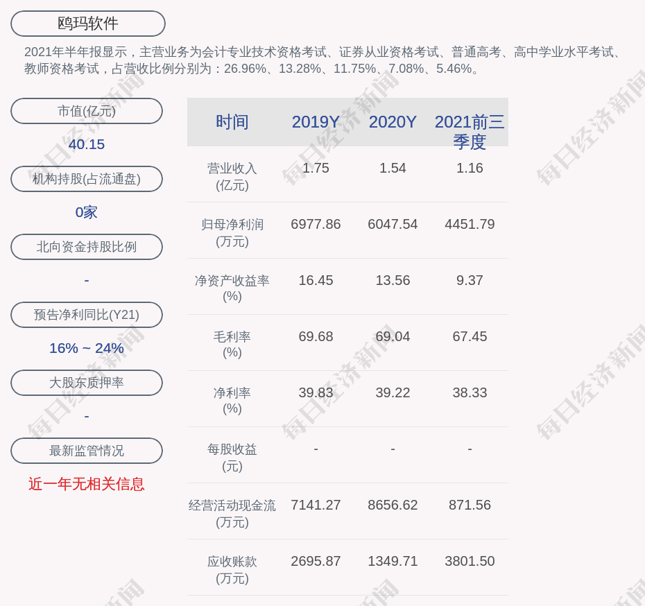 2021年半年报显示,鸥玛软件的主营业务为会计专业技术资格考试、证券从业资格考试、普通高考、高中学业水平考试、教师资格考试,占营收比例分别为:26.96%、13.28%、11.75%、7.08%、5.46%。