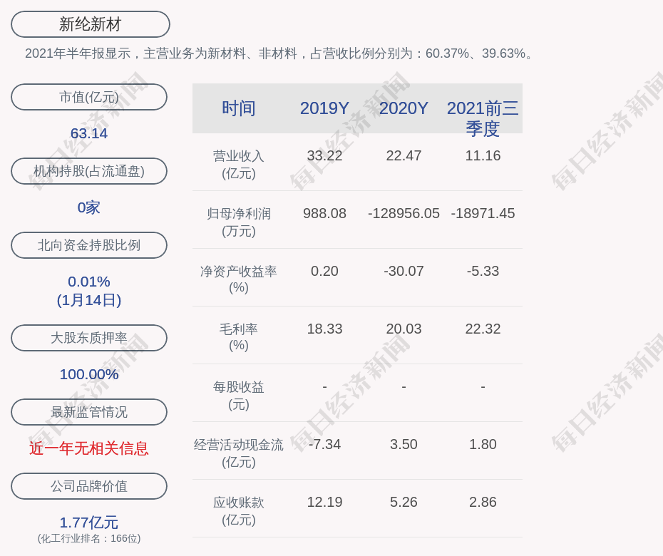 2021年半年报显示,新纶新材的主营业务为新材料、非材料,占营收比例分别为:60.37%、39.63%。