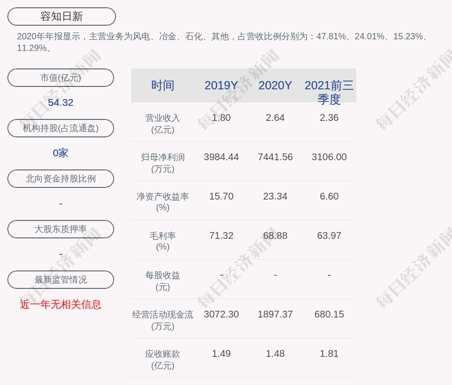 2020年年报显示,容知日新的主营业务为风电、冶金、石化、其他,占营收比例分别为:47.81%、24.01%、15.23%、11.29%。