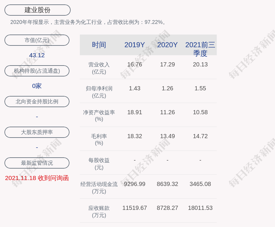 2020年年报显示,建业股份的主营业务为化工行业,占营收比例为:97.22%。