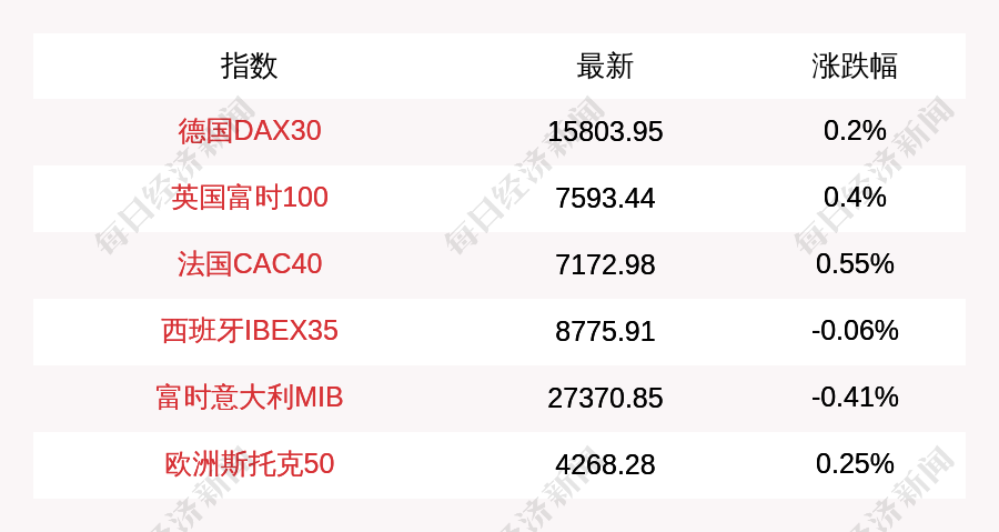 每经AI快讯:北京时间1月20日00:30,德国DAX30指数收盘上涨31.39点,涨幅为0.2%,报收15803.95点;英国富时100指数收盘上涨29.89点,涨幅为0.4%,报收7593.44点;法国CAC40指数收盘上涨39.15点,涨幅为0.55%,报收7172.98点;西班牙IBEX35指数收盘下跌5.69点,跌幅为0.06%,报收8775.91点;富时意大利MIB指数收盘下跌112.43点,跌幅为0.41%,报收27370.85点;欧洲斯托克50指数收盘上涨10.46点,涨幅为0.25%,报收4268.28点。