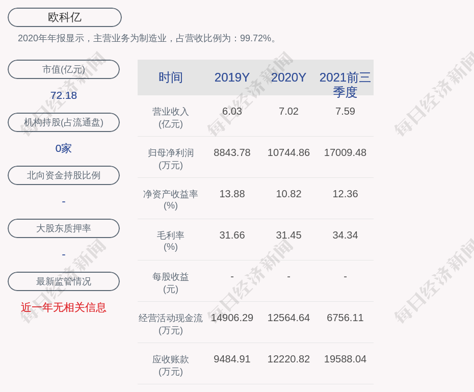 2020年年报显示,欧科亿的主营业务为制造业,占营收比例为:99.72%。