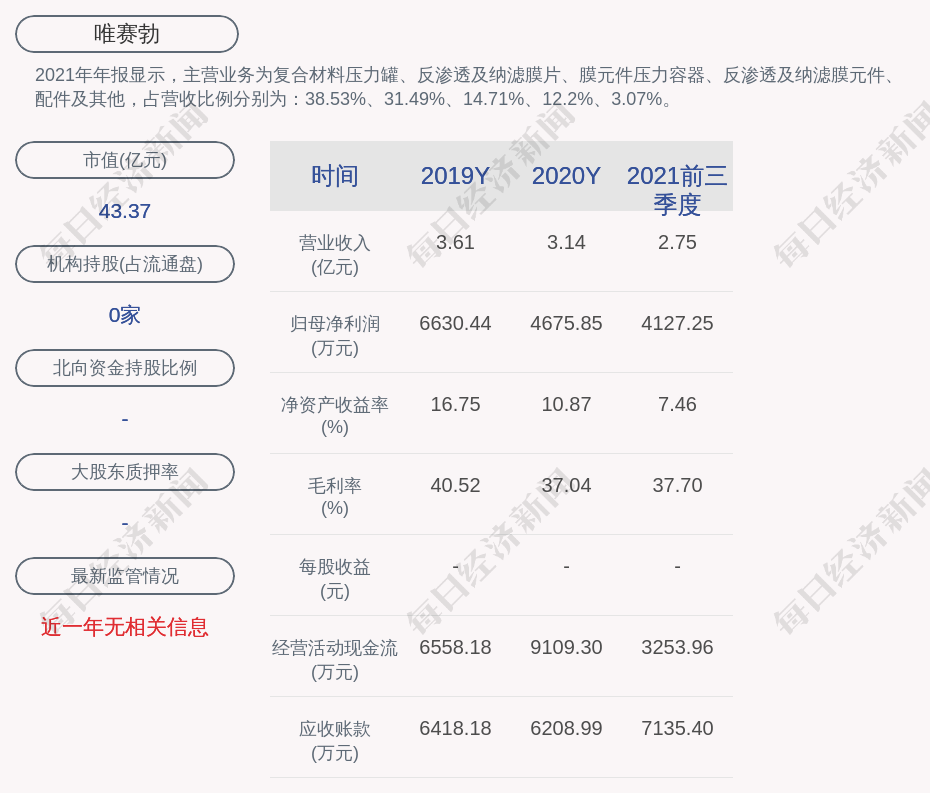 2021年年报显示,唯赛勃的主营业务为复合材料压力罐、反渗透及纳滤膜片、膜元件压力容器、反渗透及纳滤膜元件、配件及其他,占营收比例分别为:38.53%、31.49%、14.71%、12.2%、3.07%。
