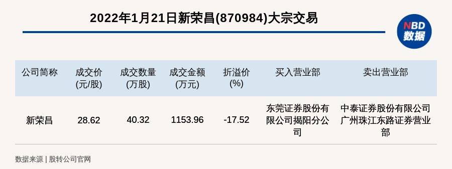 每经讯,2022年1月21日,新三板创新层公司新荣昌(870984)发生一笔大宗交易,成交价28.62元/股,成交数量40.32万股,成交金额1153.96万元,折价17.52%。买入营业部是东莞证券股份有限公司揭阳分公司,卖出营业部是中泰证券股份有限公司广州珠江东路证券营业部。