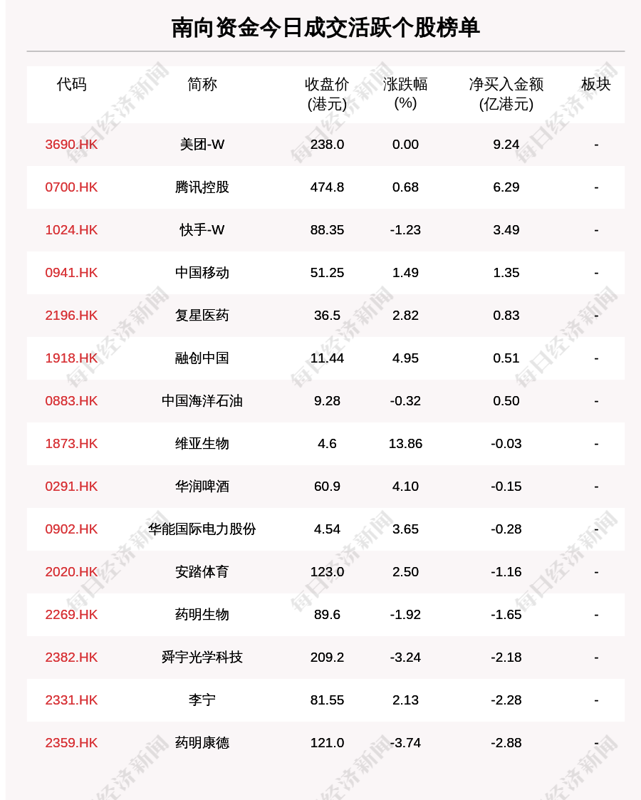 南向资金成交活跃个股榜单中,净买入个股共7只,金额最多的是美团-W(3690.HK,收盘价:238.0港元),净买入9.238亿港元;净卖出个股共8只,金额最多的是药明康德(2359.HK,收盘价:121.0港元),净卖出2.877亿港元。