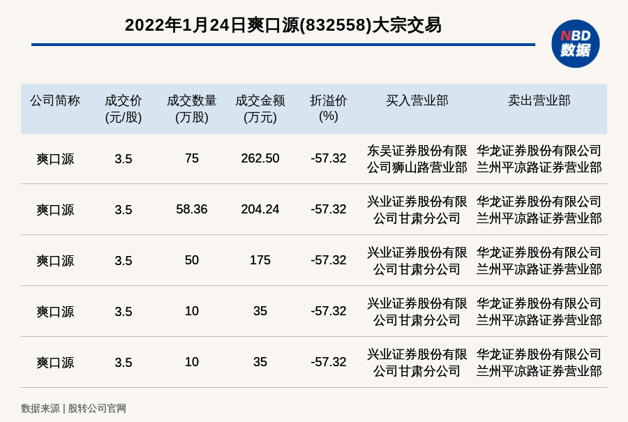 每经讯,2022年1月24日,新三板创新层公司爽口源(832558)发生5笔大宗交易,总成交金额为711.74万元,成交金额最高的一笔成交价3.5元/股,成交数量75万股,成交金额262.50万元,折价57.32%。买入营业部是东吴证券股份有限公司狮山路营业部,卖出营业部是华龙证券股份有限公司兰州平凉路证券营业部。