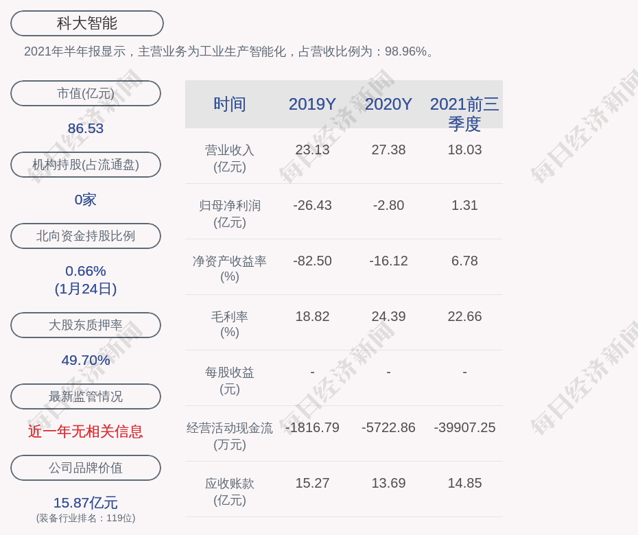 2021年半年报显示,科大智能的主营业务为工业生产智能化,占营收比例为:98.96%。