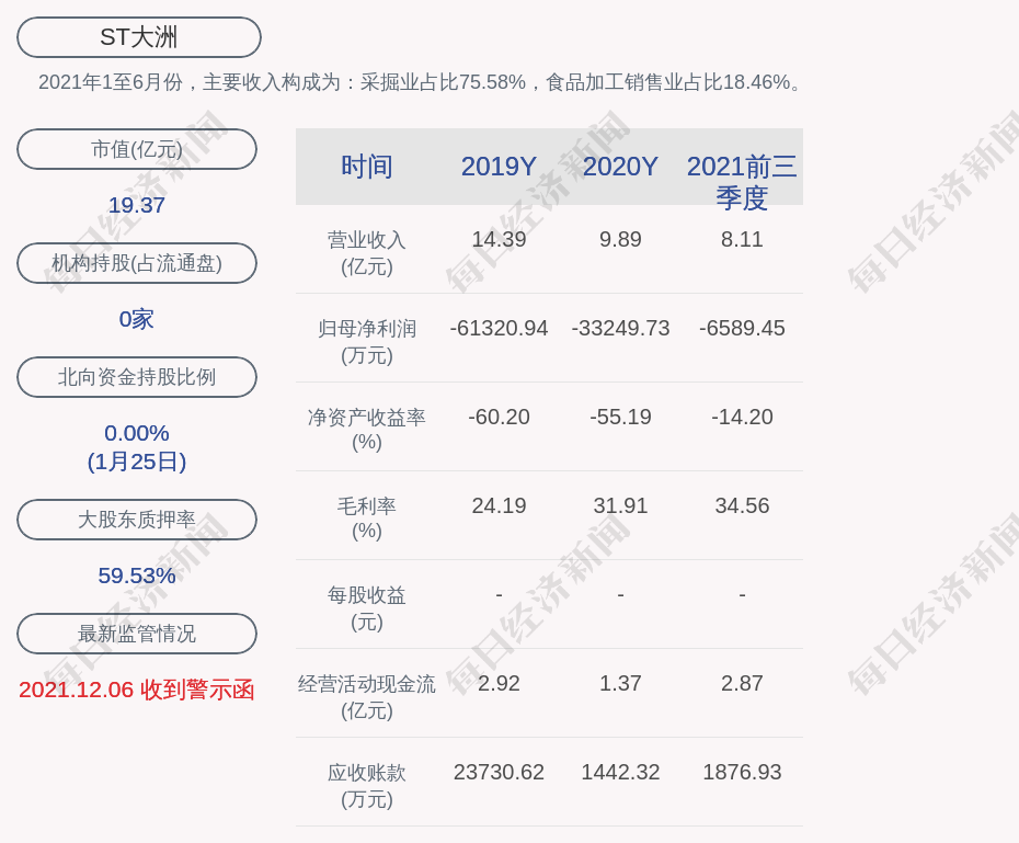 2021年1至6月份,ST大洲的主要收入构成为:采掘业占比75.58%,食品加工销售业占比18.46%。