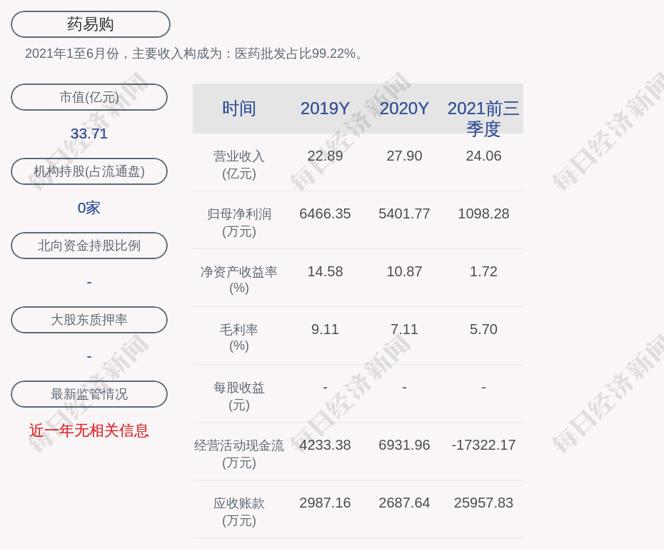 2021年1至6月份,药易购的主要收入构成为:医药批发占比99.22%。