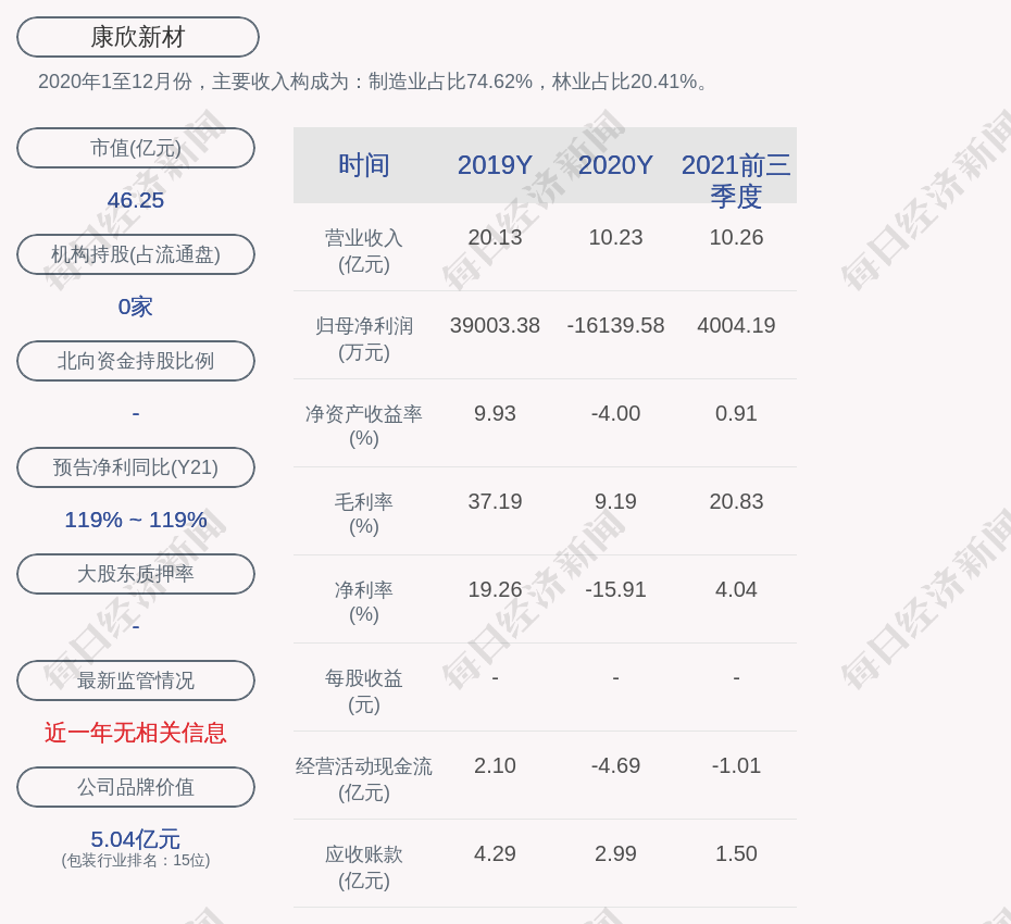 2020年1至12月份,康欣新材的主要收入构成为:制造业占比74.62%,林业占比20.41%。