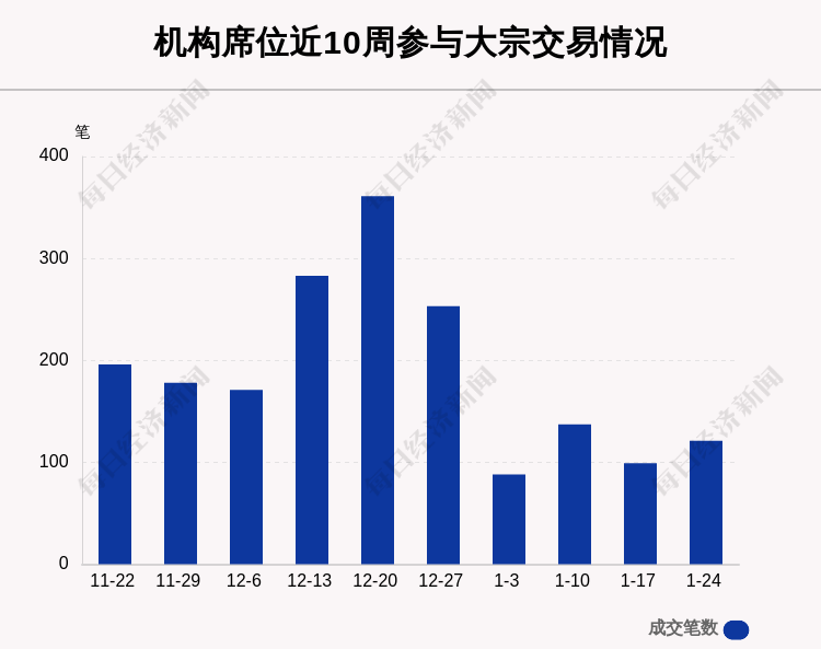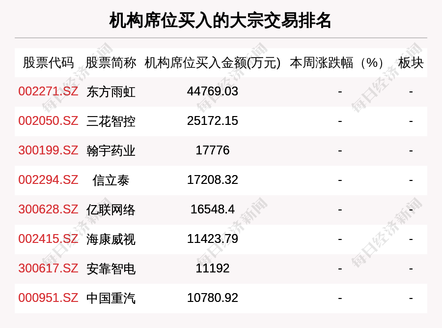 本周机构专用席位参与了121笔大宗交易,环比上周增加22笔。本周机构席位买入金额前3的公司为东方雨虹、三花智控、翰宇药业,机构买入金额分别为4.48亿元、2.52亿元、1.78亿元。